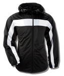 100% brushed tricot polyester • 7.2-oz. • double-ply hood with bungee cord and two toggles • contrast body and sleeve panel inserts • front pockets with headset opening • covered elastic cuffs • logo on left sleeve • Sizes: S-4XL