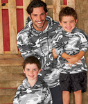 60% cotton/40% polyester print fleece • 7.5-oz. • 2-inch 1x1 ribbed cuffs and bottom band • cover-stitched neck • shoulders • armholes • hood and pouch pocket • fleece-lined hood with drawstring • urban woodland sewn with 100% cotton thread • Sizes: S-2XL