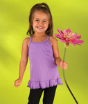 100% combed ring-spun cotton • 5.8-oz. • 1x1 baby rib knit • Double-needle reverse ribbed binding on neck, armholes and straps • Raw serge ruffle bottom • Sizes: 2T-5/6T